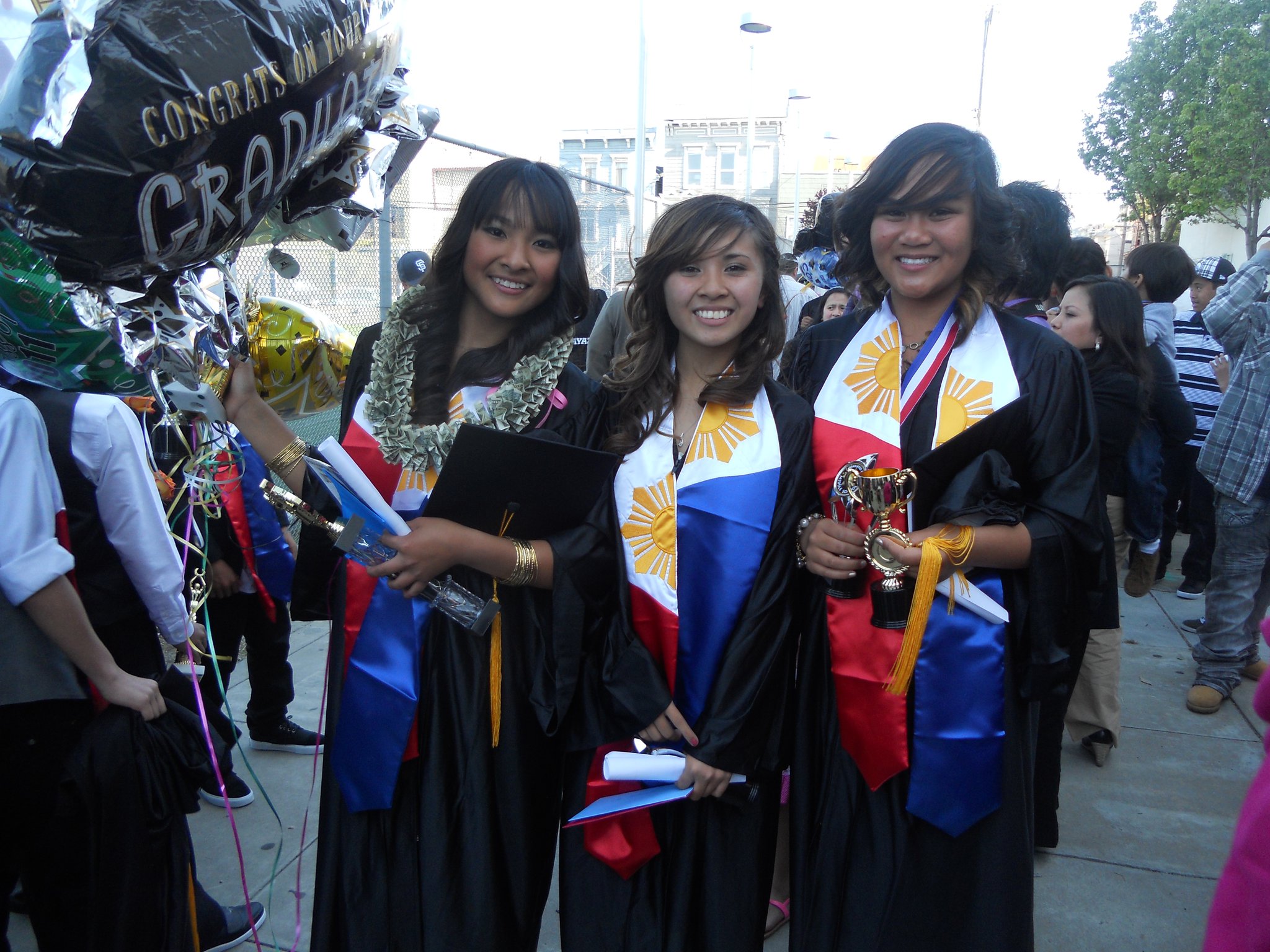 Kodakan Photo Day, Shades of San Francisco Donor description: left to right: Graduates of Bessie Carmichael Middle School - Kyrene, Grecielle, Janice. Graduation Day at John O'Connell High School with best friends since Bessie Carmichael Elementary School. Best friends at graduation wearing Philippine flag sashes given to them from school.