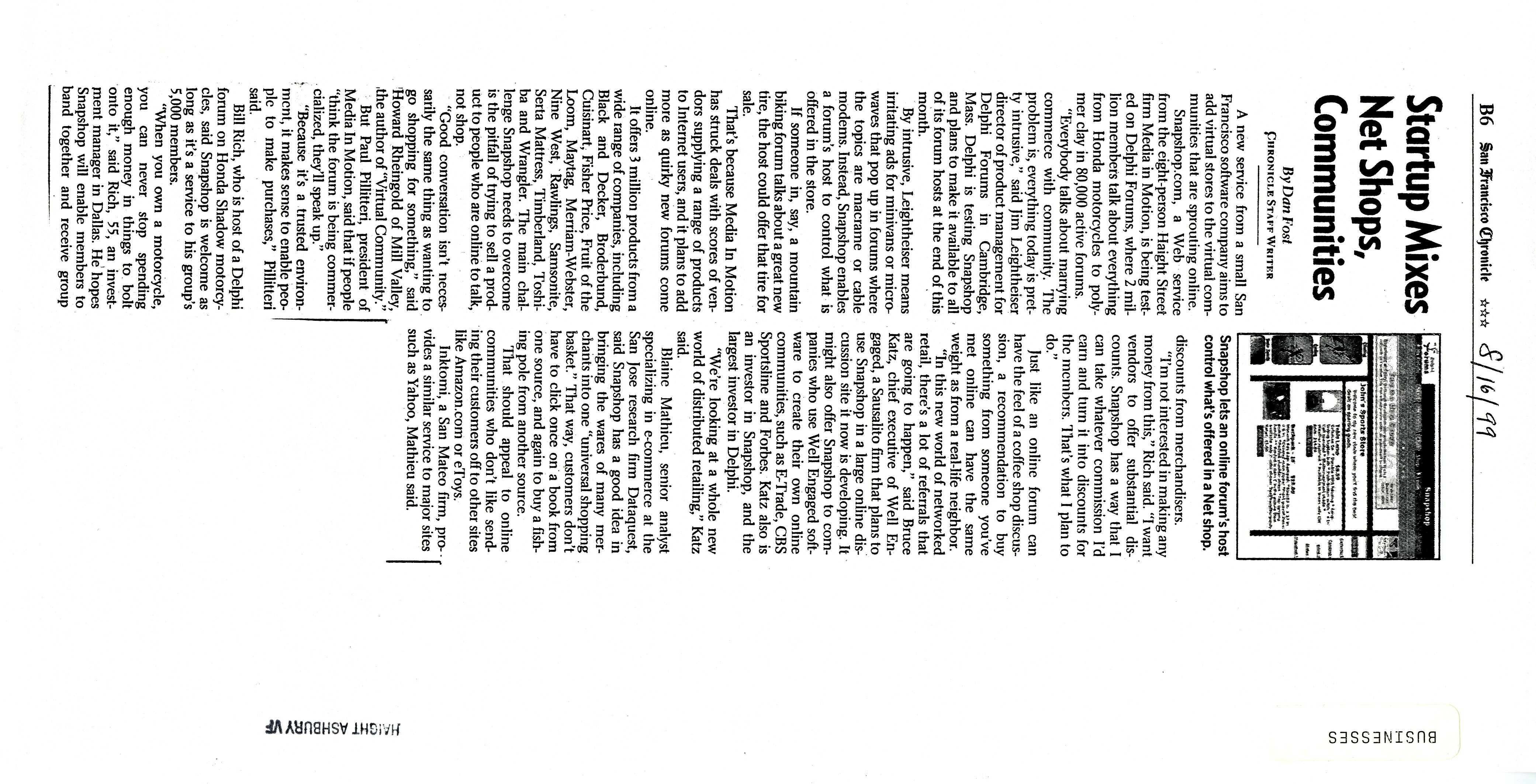 Startup Mixes Net Shops..., SF Chronicle, August 16 1999