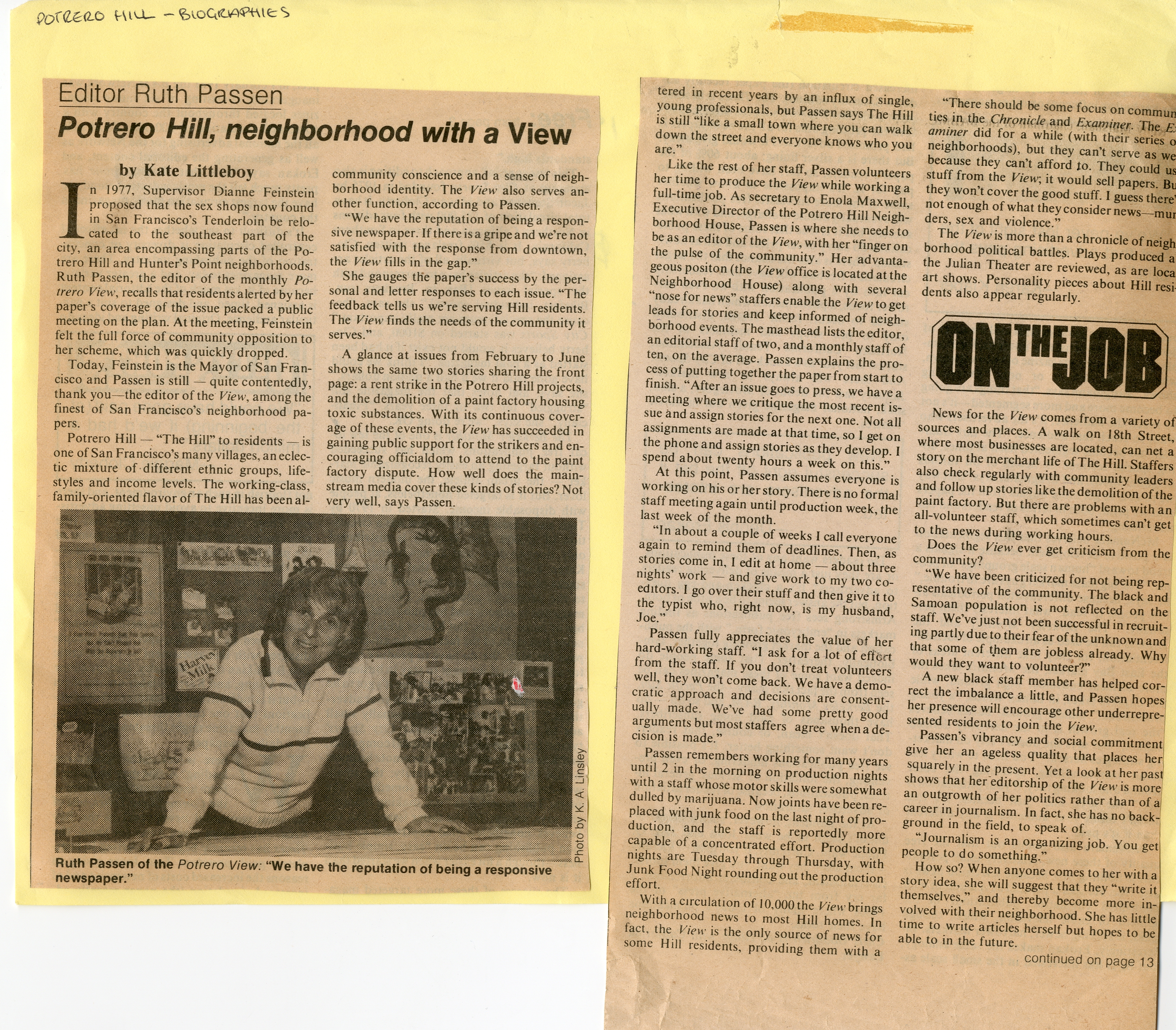 Editor Ruth Passen, Potrero Hill, Neighborhood with a View, Potrero Hill Biographies